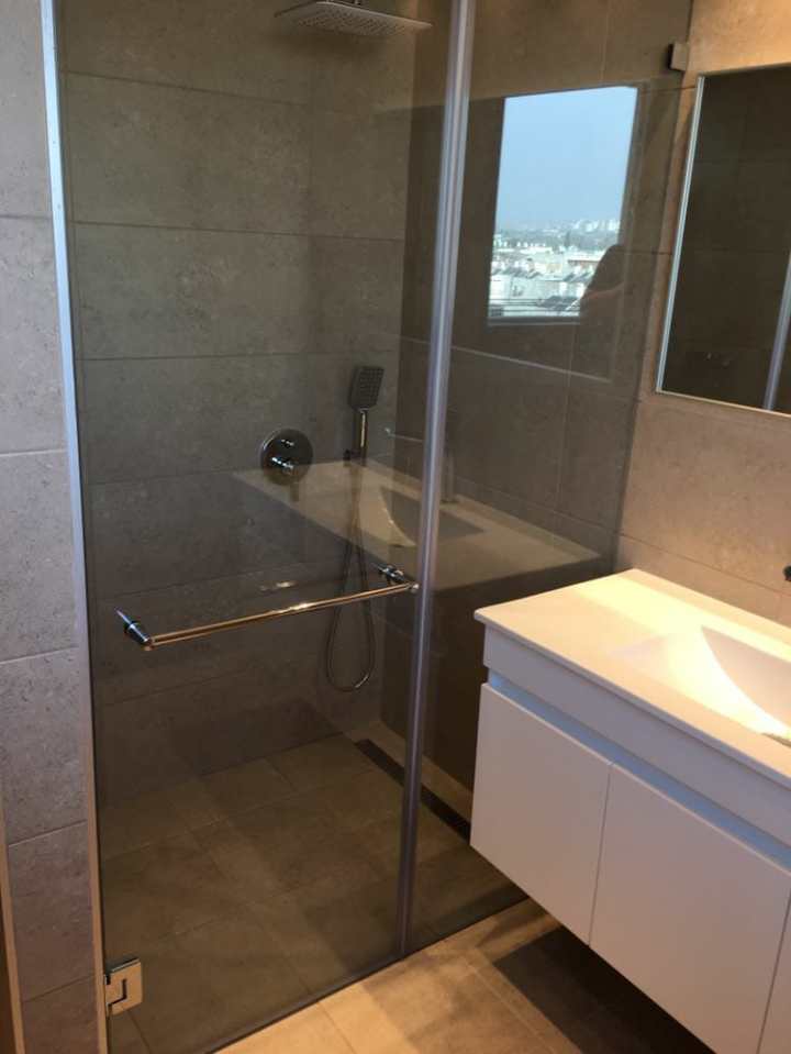 תהליך השינוי מול הקבלן כלל שינוי מיקום מכונת כביסה לתוך חדר הרחצה והוספת חדר רחצה נוסף (מינימליסטי) באזור מכונת הכביסה.