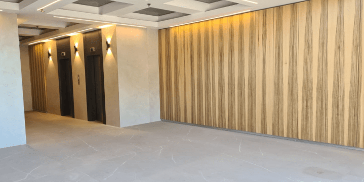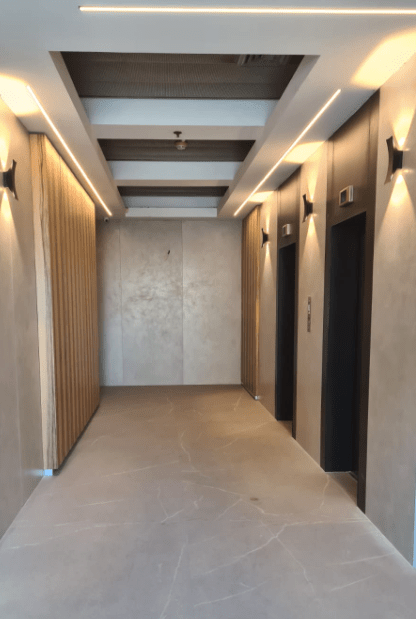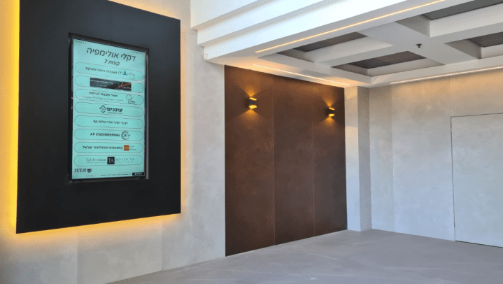 בנין משרדים בקרית מטלון בפתח תקווה. נתבקשתי על ידי החברה המנהלת לעצב מחדש את לובי הבניין. דרישת הלקוח היתה עיצוב- נקי ואלגנטי. לחיפוי הקירות והרצפה נבחרו אריחי ענק בגודל 150*300 ס"מ בגוונים אפור/שחור ולסגירת ארונות למערכות הבניין נבחרו דלתות נגרות בחיפוי פורניר אגוז אפריקאי. השילוב בין החומרים יצר מראה נקי ויחד עם זאת מעניין בזכות ה"תנועה" הקיימת בפורניר העץ. להשלמת המראה -נבחרו לוחות שילוט ממוחשבים שמוסגרו בפרט נגרות בגוון שחור ששולבה בתוכו תאורת לד.