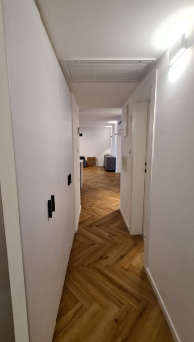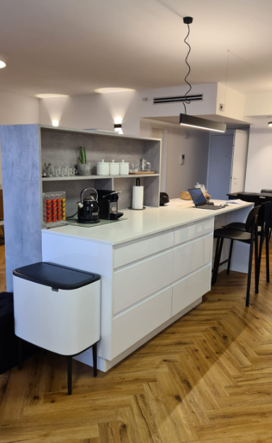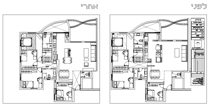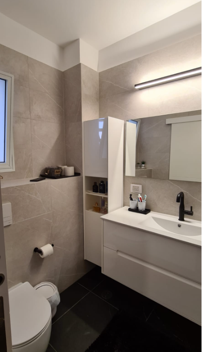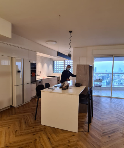 זוג+3 ילדים בוגרים הגיעו אלי דרך המלצה של חברה. לזוג דירת 5 חדרים במרום נווה ברמת גן. הדירה פונה מערבה וצופה לנוף פנורמי יפהפה של כל גוש דן (מרשים ביותר בשעות הלילה), ולכן המלצתי היתה לאחד את חלל הסלון עם המטבח ולפתוח את מרפסת השרות הצמודה למטבח. התקבל חלל יפהפה מרווח ונעים לארוח ושהייה. בנוסף שופץ אזור השינה וחדרי הרחצה ורוצפה הדירה כולה בפרקט במנח פישבויין, מה שהוסיף חמימות ויוקרה .