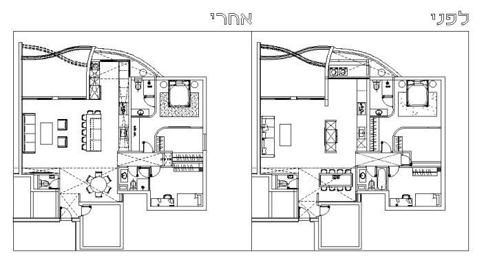 זוג ,שהופנה אלי דרך לקוחה שהיא בת משפחה של הזוג, ולהם 3 ילדים מתבגרים, ש-2 מהם כבר "עזבו את הקן" ונותר להתגורר עימם "בן הזקונים", החליטו לשפץ את דירתם ולהפוך אותה לדירה מעודכנת ומתוכננת המתאימה לצרכים הפונקציונליים החדשים. במסגרת ההתאמה לצרכים החדשים, נדרשה הסבה של חדר לחדר ארונות מרווח שישמש את יחידת ההורים. בנוסף, נדרש אזור ארוח מרווח לארוחות משפחתיות והגדלת המטבח.
