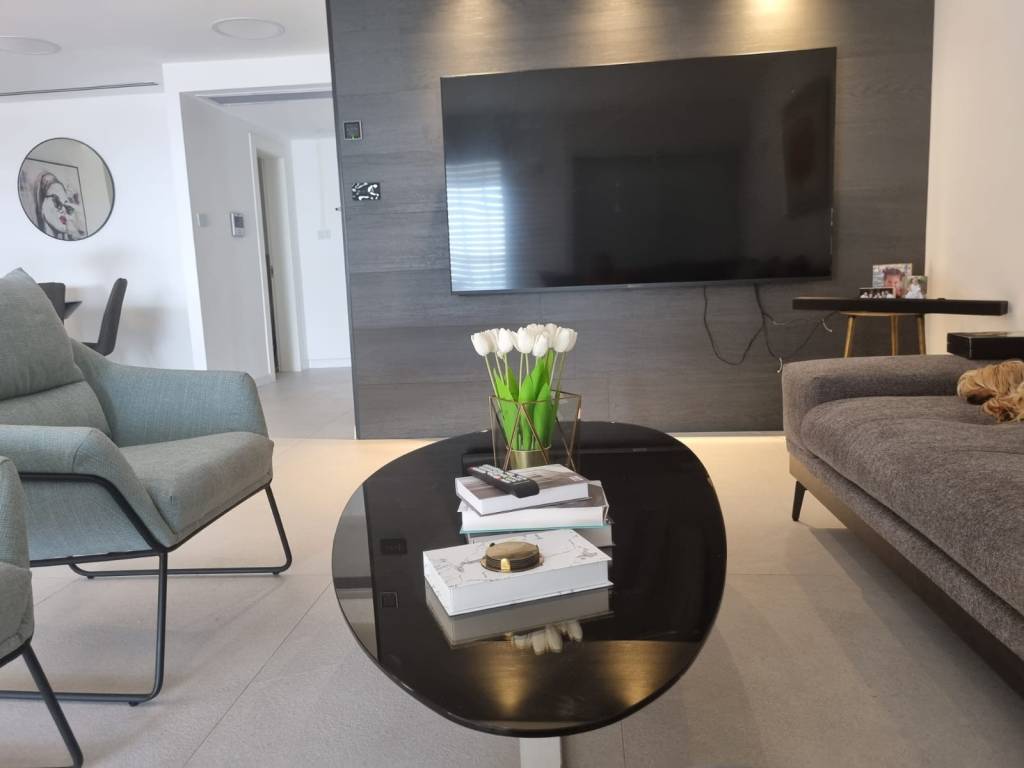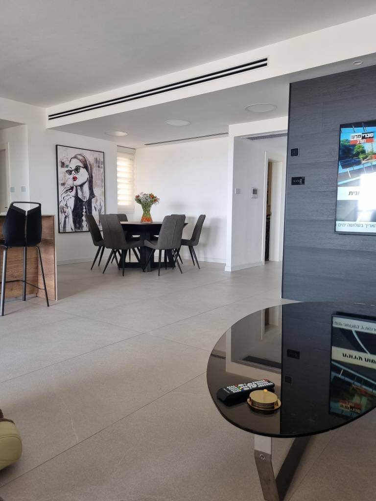 הדירה בקומה גבוה ולה נוף פנורמי של כל גוש דן (מרשים ביותר בשעות הלילה), ולכן המלצתי היתה לאחד את חלל הסלון עם המטבח ולספח את אזור השרות למטבח.
